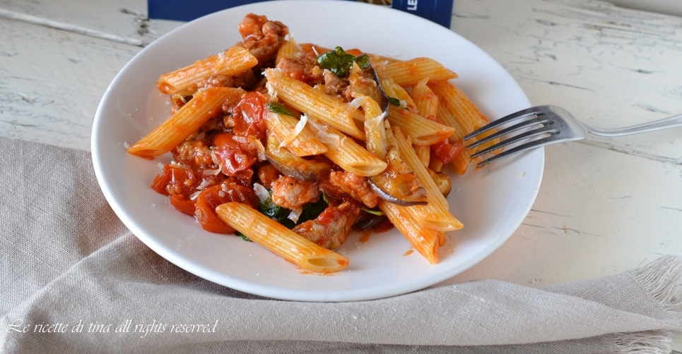 Servite la pasta melanzane e salsiccia ancora calda in piatti individuali, aggiungete altro basilico e buon appetito!